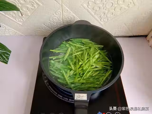 5.鍋中放清水,放一勺食用鹽,幾滴食用油,水開後放入四季豆,焯水三分鐘撈出,再過一遍涼水,這樣做,四季豆易煮熟,顏色青翠不發黃。