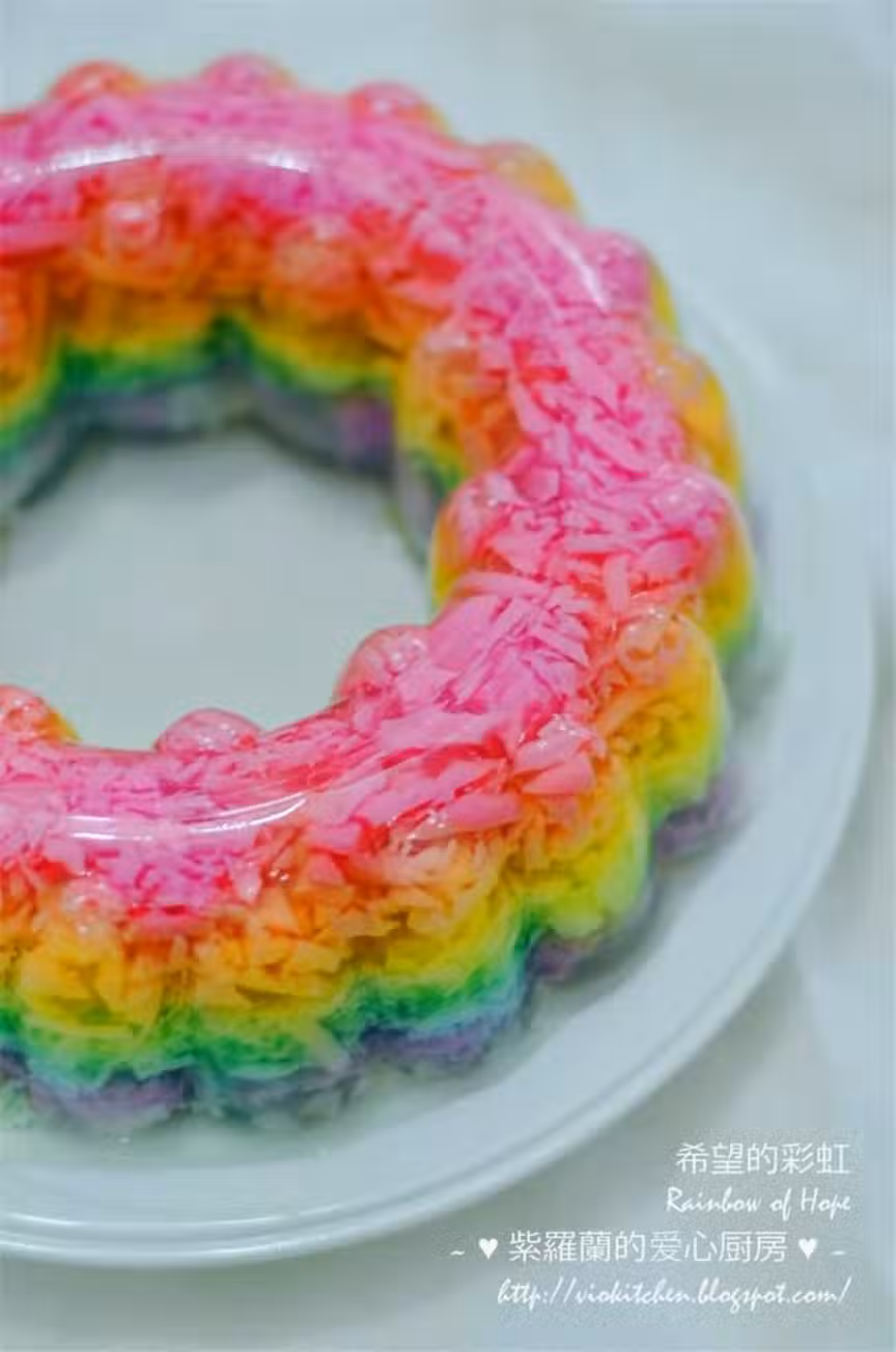 食譜原名為「黃昏彩虹Rainbow at Dusk」,燕菜的顏色次序是紅,黃,藍,青,橙,紫和白,我把這燕菜改名為「希望的彩虹Rainbow of Hope」,燕菜的顏色次序改為跟彩虹一樣,紅,橙黃,青,藍,紫,然後把白色放在最後的那一層。