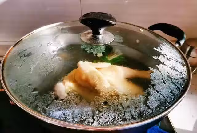 6.20分鐘過去了,雞煮好了,先不要著急拿出來,可以讓它再泡幾分鐘熱水澡,這樣做可以讓雞肉更原汁原味。