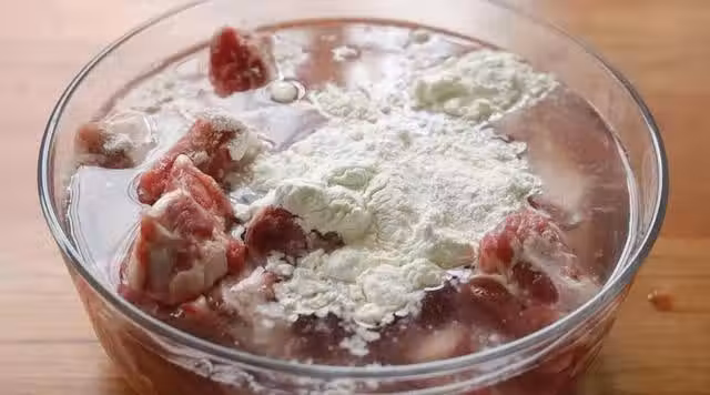 3、再把排骨反覆多清洗幾遍,直到排骨有點發白就差不多了;