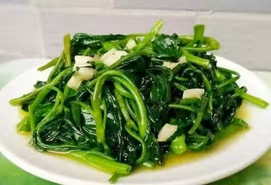 4.讓水菠菜翻炒幾次,翻炒至葉子被切碎,然後加入適量的鹽,將剩下的蒜末放入鍋中