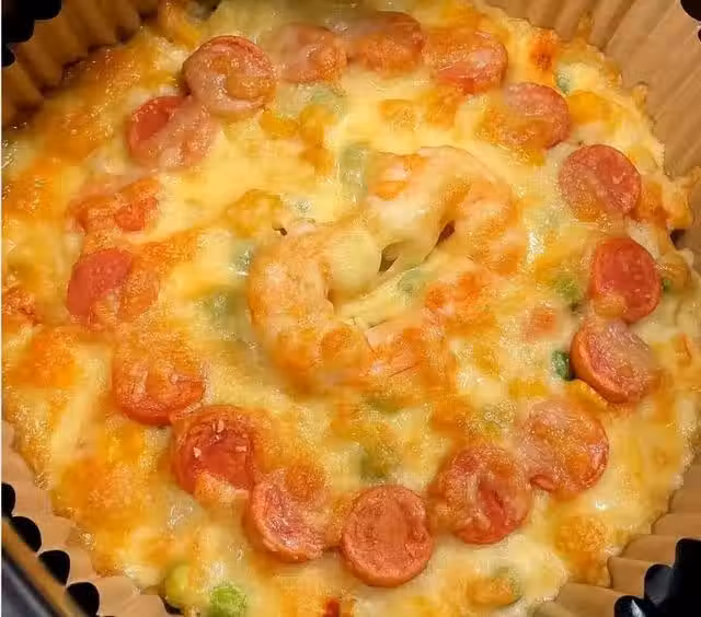 2.空氣炸鍋底鋪油紙,把饅頭丁鋪滿底部,均勻地淋上一層雞蛋液,擠一些番茄醬,鋪一層芝士,把火腿腸擺成圓圈,撒入青豆、玉米粒,中間擺上幾個蝦仁,上面再撒一層芝士碎,160度,烤20分鐘。