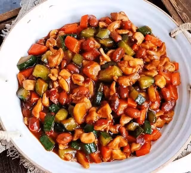 (6)再放入黃瓜丁、花生米、雞肉丁翻炒片刻,倒入調好的料汁翻炒均勻。
