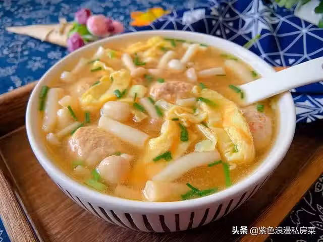 6.丸子浮起來就熟了,放海鮮菇,放少許鹽,再放雞蛋絲,放胡椒粉雞精,撒上香蔥即可。