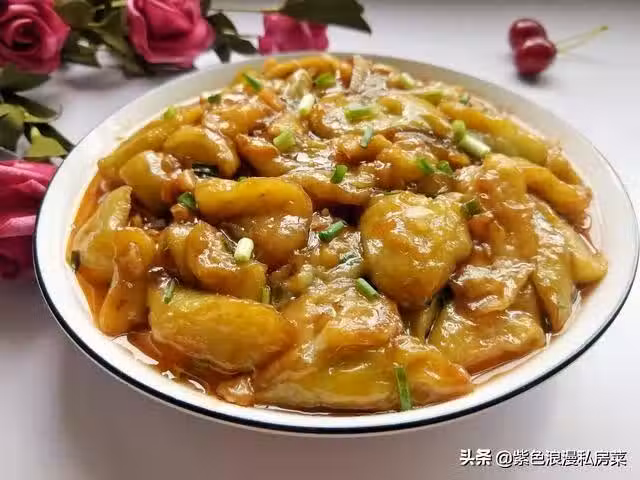 4.鍋內留底油,放大蒜爆香,放入茄子,倒入糖醋汁,大火燒開,放胡椒粉雞精,撒上香蔥即可出鍋。