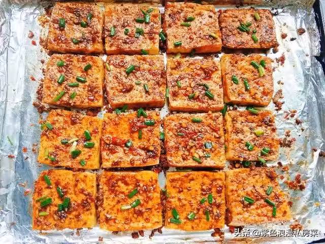 7.時間到,取出,撒上香蔥,美味的香辣孜然烤豆腐就做好啦!五元錢一大盤,自己做的就是經濟實惠呀!香噴噴的愛極了!