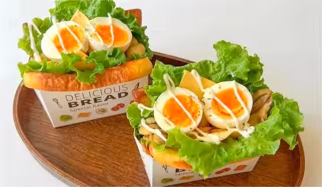 步驟五:在吐司片上面鋪一層生菜片,然後放上一片芝士片,然後將口蘑片鋪在上面,最後放上兩顆糖心蛋,擠上一點醬汁即可。