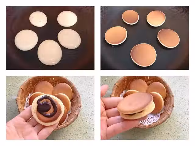 2、蛋糊製作好以後,裝入裱花袋,平底鍋小火燒熱,小火烙至表面有大氣泡冒出,然後翻面烙十幾秒即可,第二次再進行烙的時候一定要將平底鍋用濕毛巾冷卻一下,這樣烙出來的顏色才會更均勻好看。