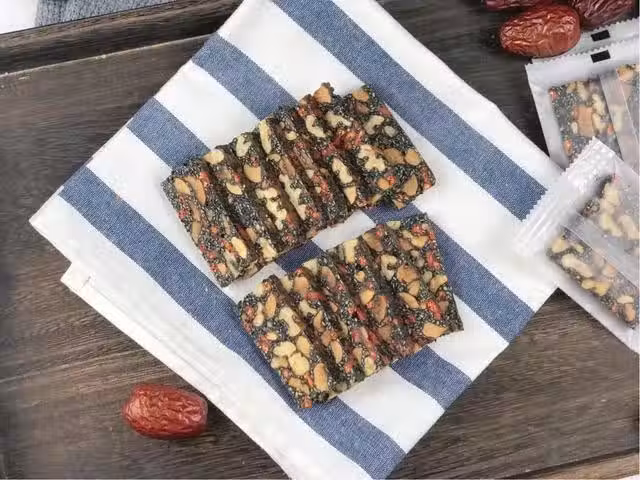 阿膠塊200克、黃酒500克、熟核桃仁240克、熟黑芝麻480克、棗肉240克、枸杞120克、冰糖粉120克