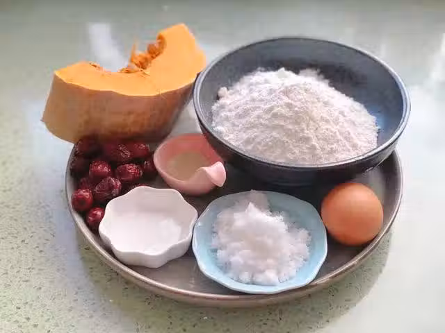 ①、準備好食材,將南瓜挖去瓜瓤,削去外皮,切成薄片裝在盤子中,上鍋蒸爛。蒸好後用料理機將南瓜打成細膩的南瓜泥,等南瓜泥晾涼至40度左右,將2克的酵母粉倒入南瓜泥中,攪拌均勻,靜置5分鐘。
