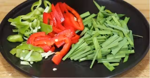 6、底面煎至定型以後翻一面繼續煎,將另一面也煎熟,兩面都定型以後將其分成小塊,然後繼續翻炒,翻炒一分鐘之後放入青紅椒炒至斷生,然後加上適量的食鹽,雞精調一下味,最後放入韭菜翻炒一下。韭菜比較容易熟,半分鐘就可以了,時間到了之後關火出鍋裝盤,美味的秋葵爆蛋就做好了。
