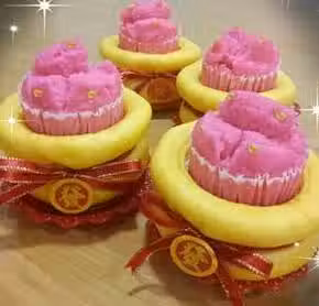 1.把所有材料(除了發粉)放入麵包機攪拌20分鐘,按停加入發粉,再攪拌20分鐘,拿出麵團分割成4份,排氣搓圓 2.用個發糕模壓在麵團中間,然後用手把麵團往上推,修飾成圓滾的造型 3.綁上彩帶(不要綁太緊)然後把杯中朝下放,發酵至雙倍大,用手指按下很快就彈起來,就是發酵好了 4.熱鍋水滾,把福袋放入鍋里大火,蒸10分鐘(為了給它更圓滾,我是把杯囗向下倒反來蒸) 福袋蒸好後,把小杯拿出來,放入發糕,綁緊彩帶就完成了!