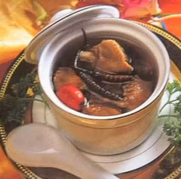 2、陳皮凈軟颳去囊。水煲滾,將冬蟲草、水鴨、無花果、陳皮、姜加入煲滾,改文火煲兩個半小時,加鹽調味。