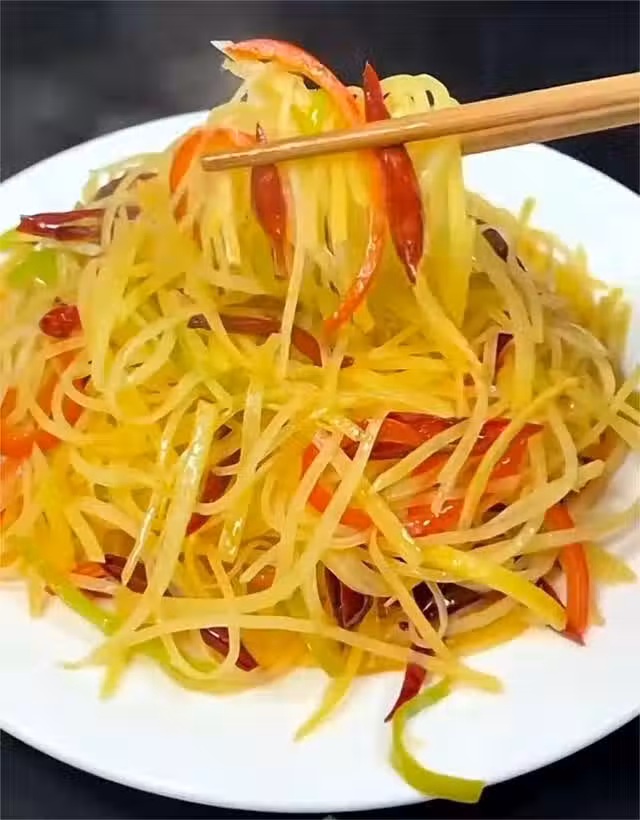 步驟三:鍋中倒油,油熱倒入薑絲、干辣椒炒香,放入青紅椒絲,翻炒一下,再加適量的鹽、雞精、一勺白醋調味,大火翻炒均勻即可出鍋。