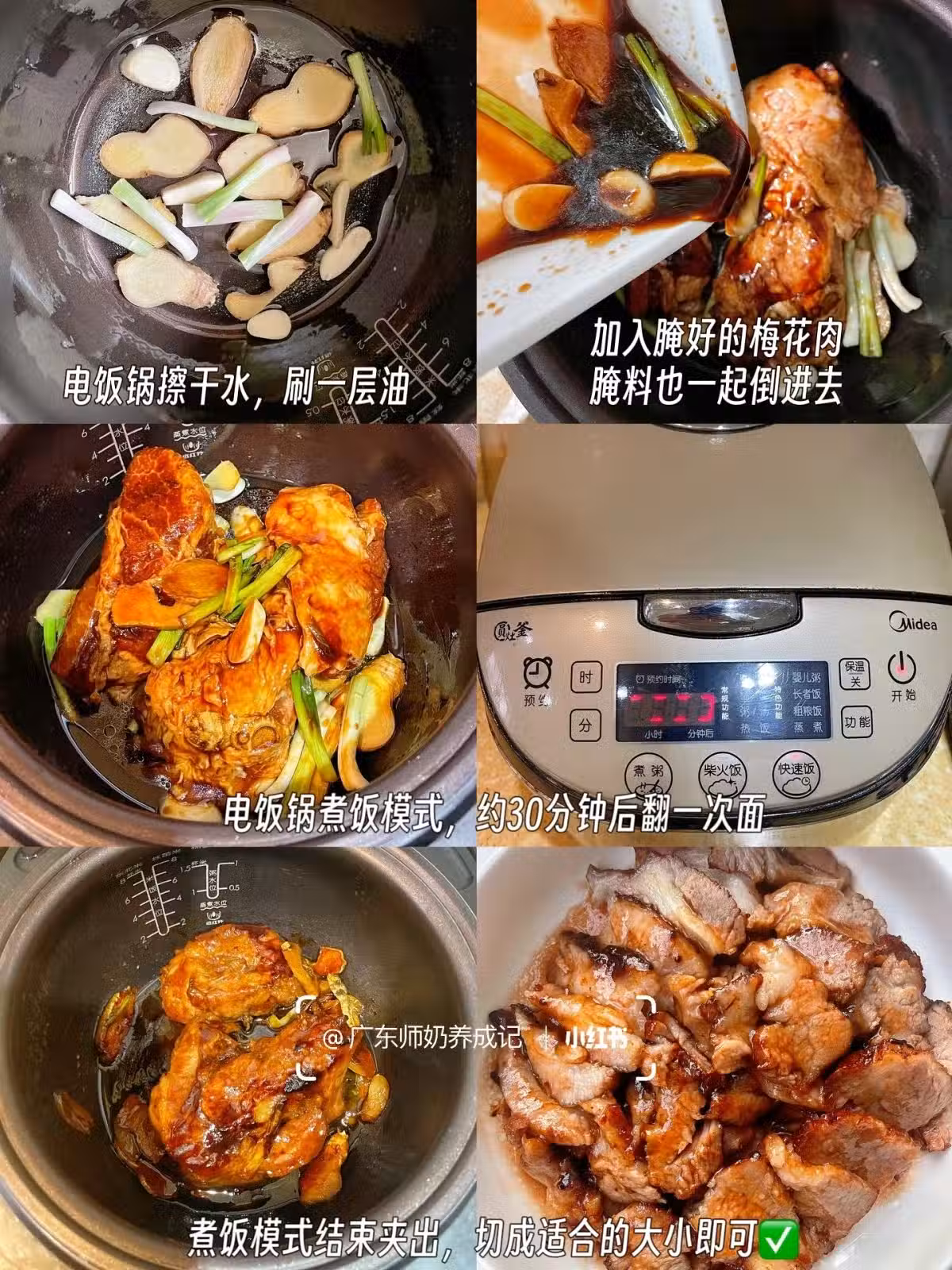 2⃣電飯鍋擦乾水分,底部刷少許油,放入蔥姜蒜和梅花肉,把剩下的腌料也倒進去,打開煮飯模式,燜30分鐘,翻一次面,再燜10分鐘。