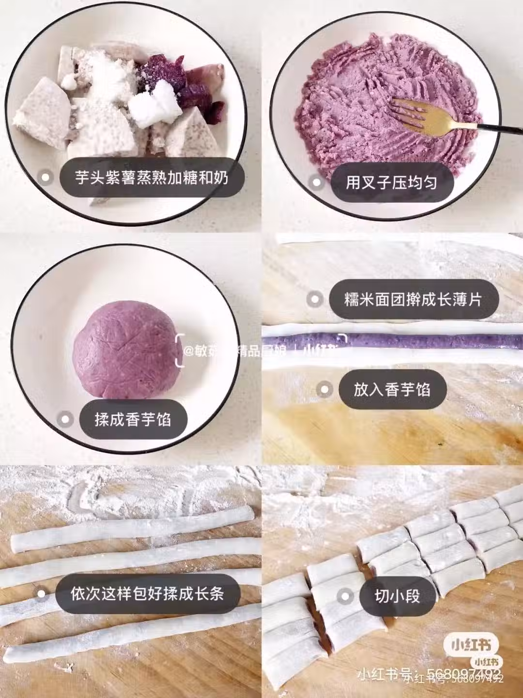 3.】面板上撒熟糯米粉,取一小塊糯米麵團,擀成長條面片,香芋餡搓長條放在長面片中間,兩邊捏好揉成光滑細長條狀,再切成段,冷藏後冰涼軟糯,好開胃的小甜點哦