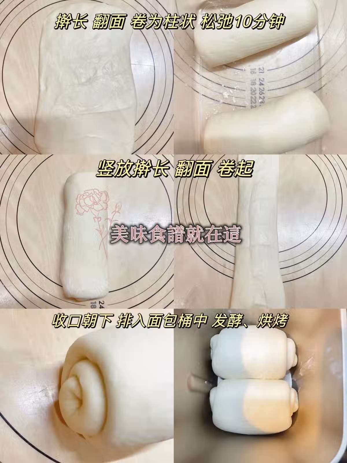3️⃣將麵糰分割為2份,滾圓、鬆弛10分鐘,再擀長,卷為柱狀,鬆弛10分鐘,最後捲起放入麵包機中,(此時麵包機剩餘工作約1:33),這時麵包機會自動進行後續的發酵,烘烤。