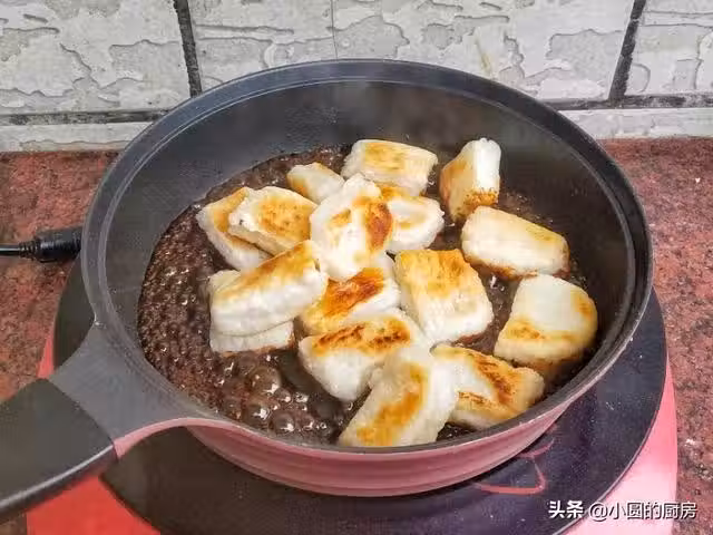 6、小火慢慢的燒制,讓糍粑均勻的裹上紅糖就可以了,一口咬下去,酥脆,潔白,香甜不膩,好吃地不要不要的#美食測評團# #我要上頭條# #美食#