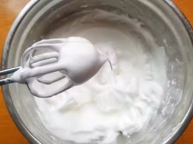 10、取一小部分打發好的蛋白霜到麵糊盆子內,用刮刀以翻拌的手法混合均勻