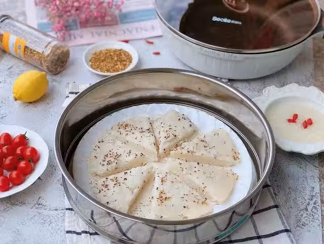 4、將米糊放入盤子中,上鍋蒸製,蒸15分鐘左右。最後在上面撒點桂花點綴一下,這樣鬆軟好吃又好看的發糕就做好了。