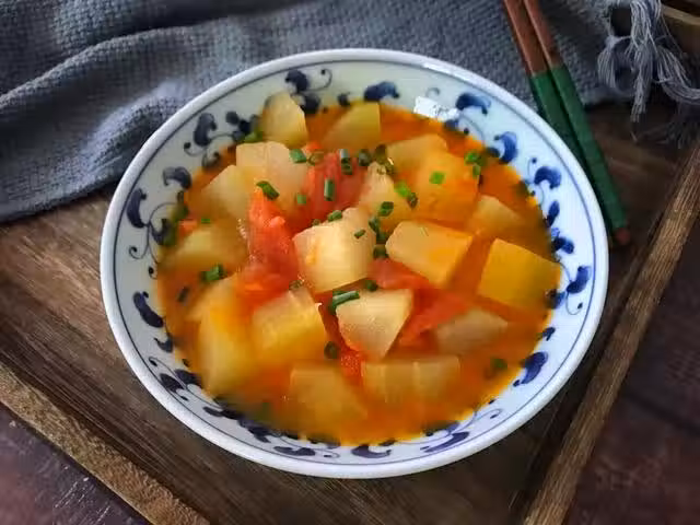 【做法】:1、冬瓜去皮後切成小塊,番茄洗凈也切成小塊。