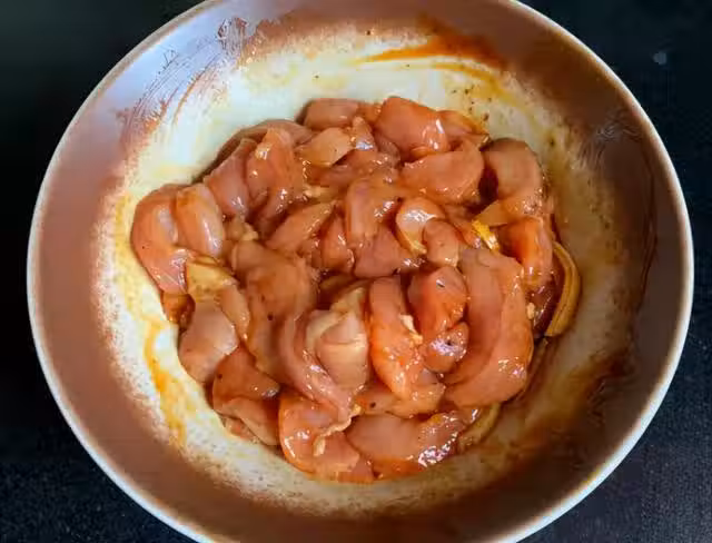 第二步,放入少許的花椒粉,將其攪拌均勻後,腌制半個小時,腌制好的豬肉,撿出生薑不要,準備一個大碗,磕入雞蛋,加入紅薯澱粉;
