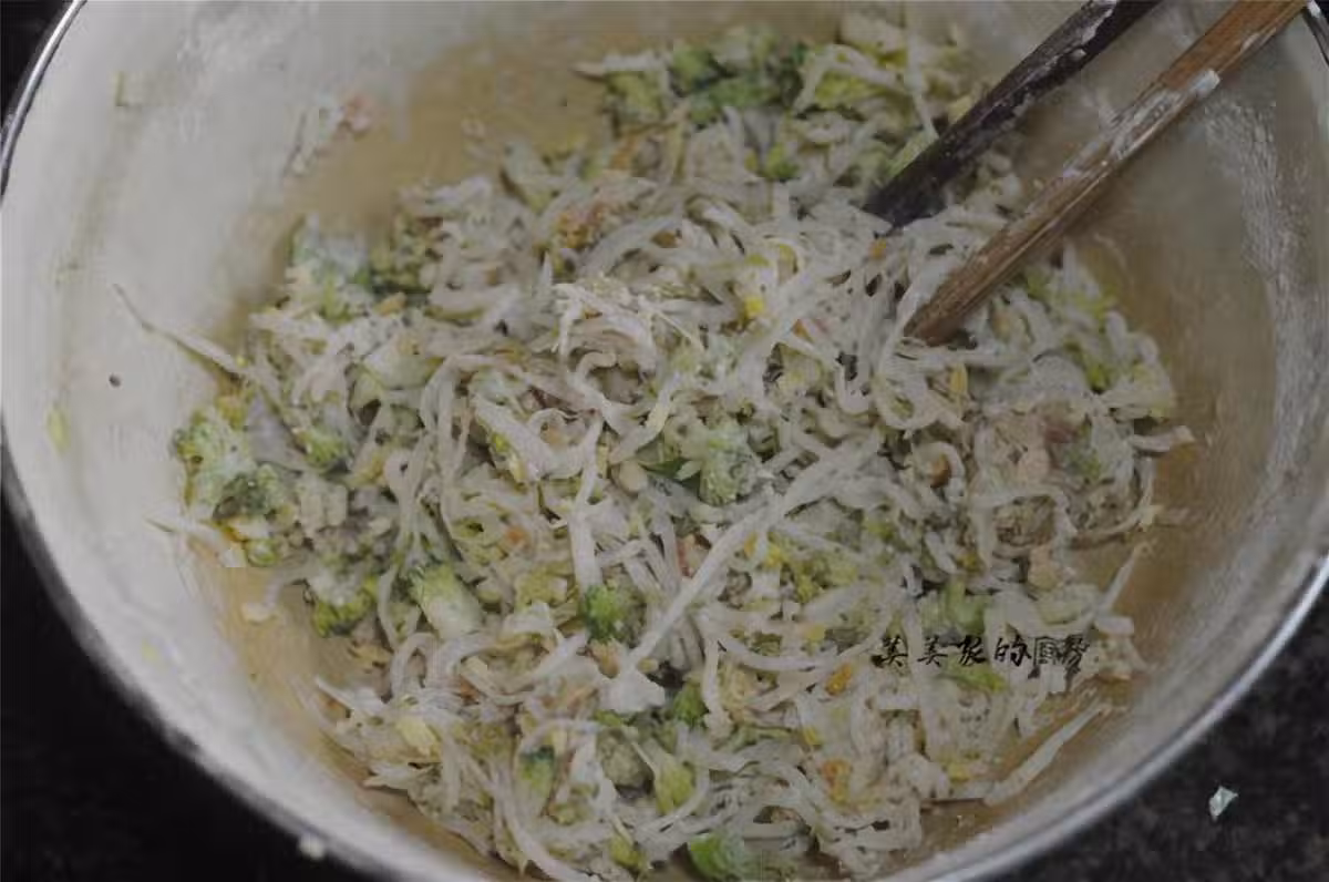最後拌成這樣鬆散不粘連的狀態,每一根蘿卜絲上都薄薄地裹著一層木薯澱粉就可以了。