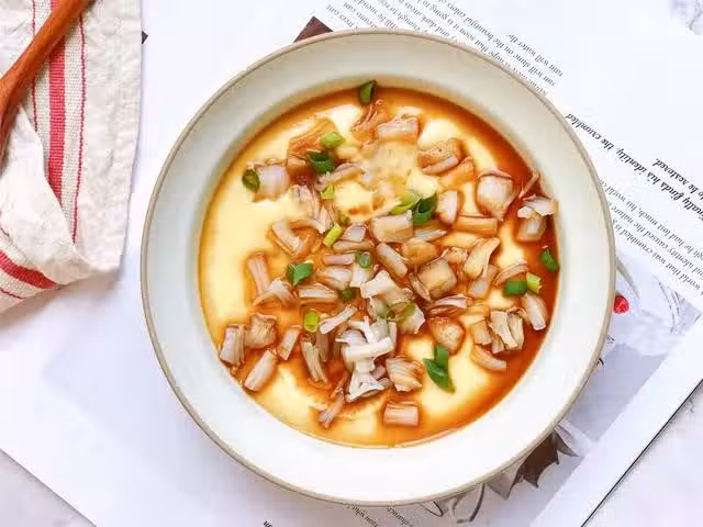 5、鍋中水大沸下,將蛋液上鍋蒸製,大火蒸8分鐘左右即可。出鍋前淋上生抽,香油,撒點香蔥點綴即可。