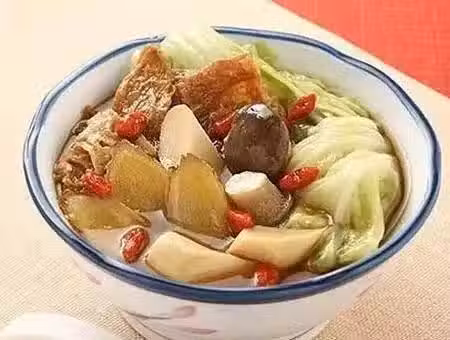 麻油和老薑都是熱性食材,能促進氣血迴圈,適合冬季手腳容易冰冷的人食用,有袪寒的作用,但冬季食用熱性食材容易燥熱上火。白菜屬性偏寒,正好可以中和麻油與老薑的熱性,也是很適合長時間燉煮的蔬菜。