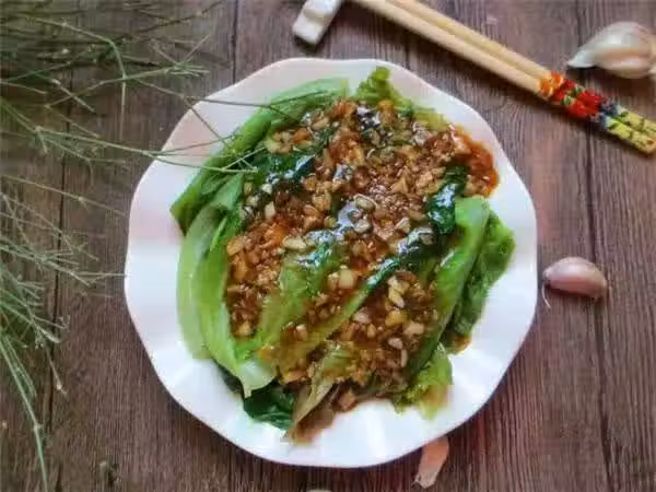 4、把調好的蠔油汁均勻淋在生菜上,最後滴上幾滴香油,蠔油生菜製作完成。