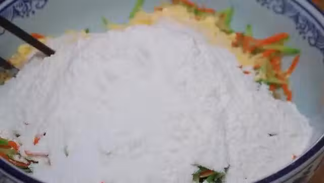 5. 用手將裹好麵粉的蘿蔔絲揉成一個光滑的麵糰,在砧板上面撒一些玉米面粉,然後放上麵糰用手輕輕壓扁,再用擀麵杖將它擀成一張圓圓的薄麵餅,麵餅上面灑一點黑芝麻,用手輕輕壓一下以防脫落,然後將麵餅改刀切成均勻的正塊小塊備用。