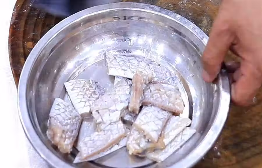 把蔥薑汁倒在裝有帶魚的盆中,加入一勺食鹽,一勺胡椒粉,少許料酒去腥,抓拌均勻腌制15分鐘。