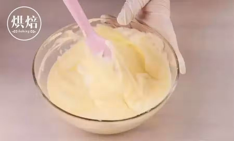 再將拌好的蛋糕糊倒回蛋白霜盆中,混合翻拌均勻,切記不要用轉圈圈的手法,容易消泡。做好的蛋糕糊是會有一定的流動性,如果完全沒有流動性,那就是蛋白打發太硬了!