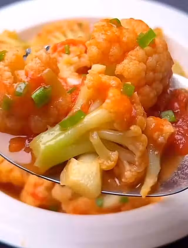 步驟二:鍋中燒油,把蒜末炒香,然後倒入番茄丁,炒出番茄汁,加入1勺番茄醬,把花菜倒入鍋中,翻炒均勻,加1勺生抽、一點蚝油,翻炒入味,即可出鍋。