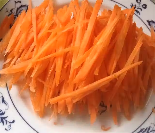 步驟三:熱油爆香蒜片,加胡蘿蔔絲中火翻炒,加一點鹽可以更容易炒軟,炒軟後加青椒絲,翻炒斷生,再下雞蛋翻炒均勻,最後加半勺鹽、半勺雞精調味,即可出鍋。