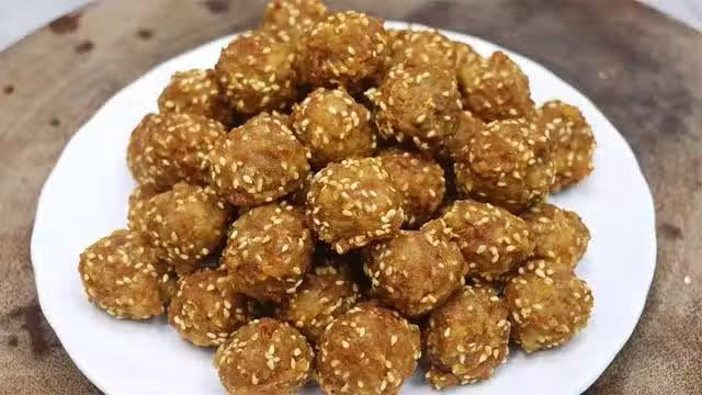4、油溫5成,丸子做成圓形下鍋油炸,定型考出,升溫復炸一次,把表面炸脆即可;