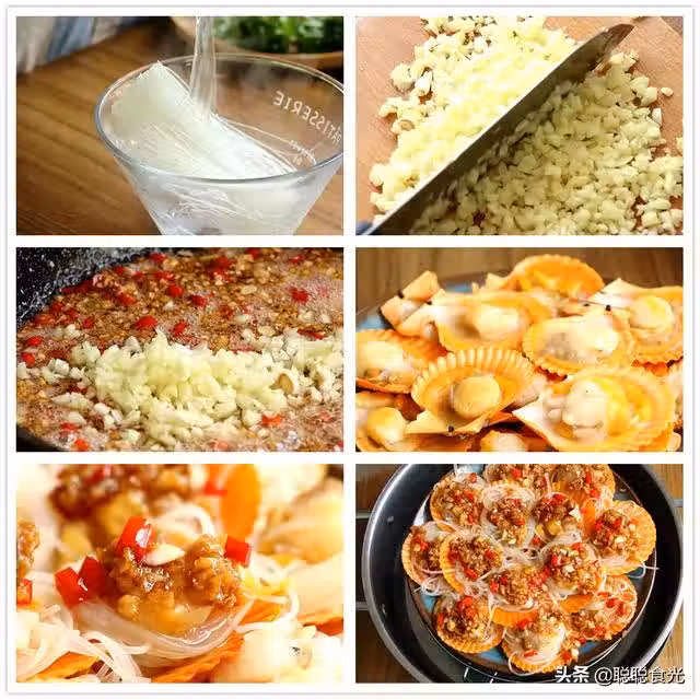 7、拿起少量粉絲,沿著2根手指纏幾圈,然後放在扇貝殼上面,在中間的空隙中放入1個扇貝肉,在每一個扇貝上面放1勺蒜油。