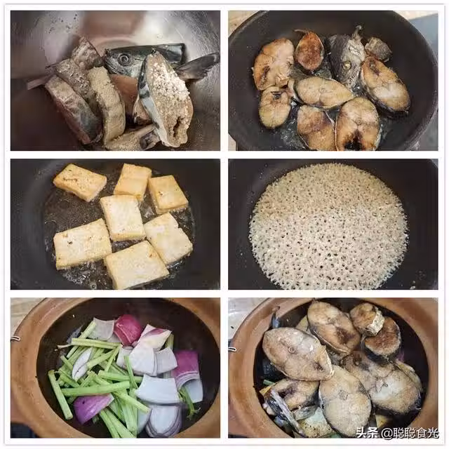 2、鍋里倒油,放入馬鮫魚片煎至兩面金黃備用。再把豆腐也煎一下。