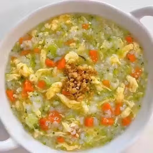鍋中熱油,倒入胡蘿蔔碎翻炒,加入提前煮好的大米粥,小火煮幾分鐘