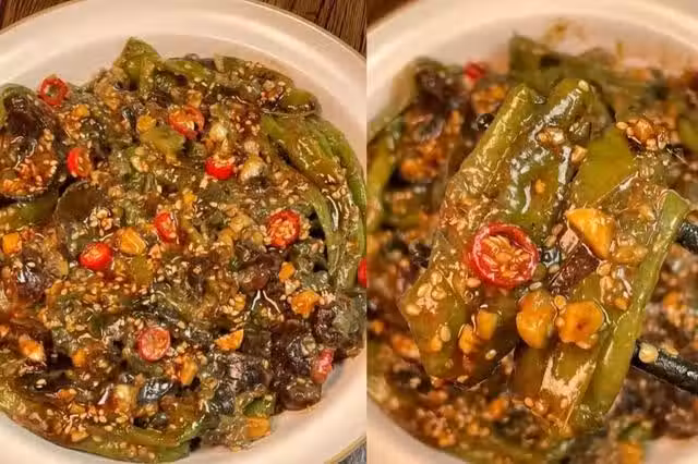 4、把皮蛋碾碎,放入尖椒條中,倒入料汁拌均勻即可!