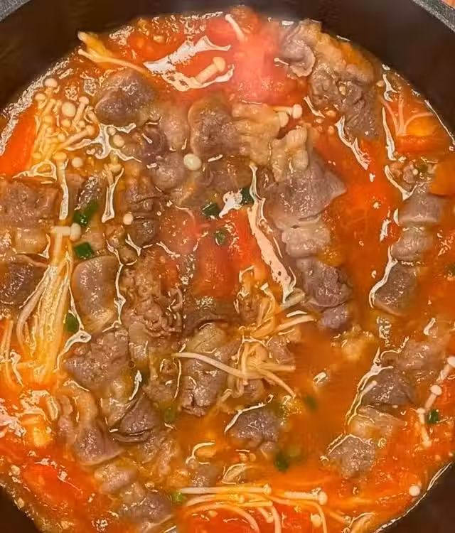 步驟:兩個番茄去皮,一個切丁,一個切片;肥牛焯水撈出備用;砂鍋里出熱油,倒入番茄炒出汁水;加一勺鹽,一勺生抽;加2碗清水,擺上金針菇和番茄,蓋上蓋子煮到沸騰;最後倒入肥牛再次煮到沸騰即可。