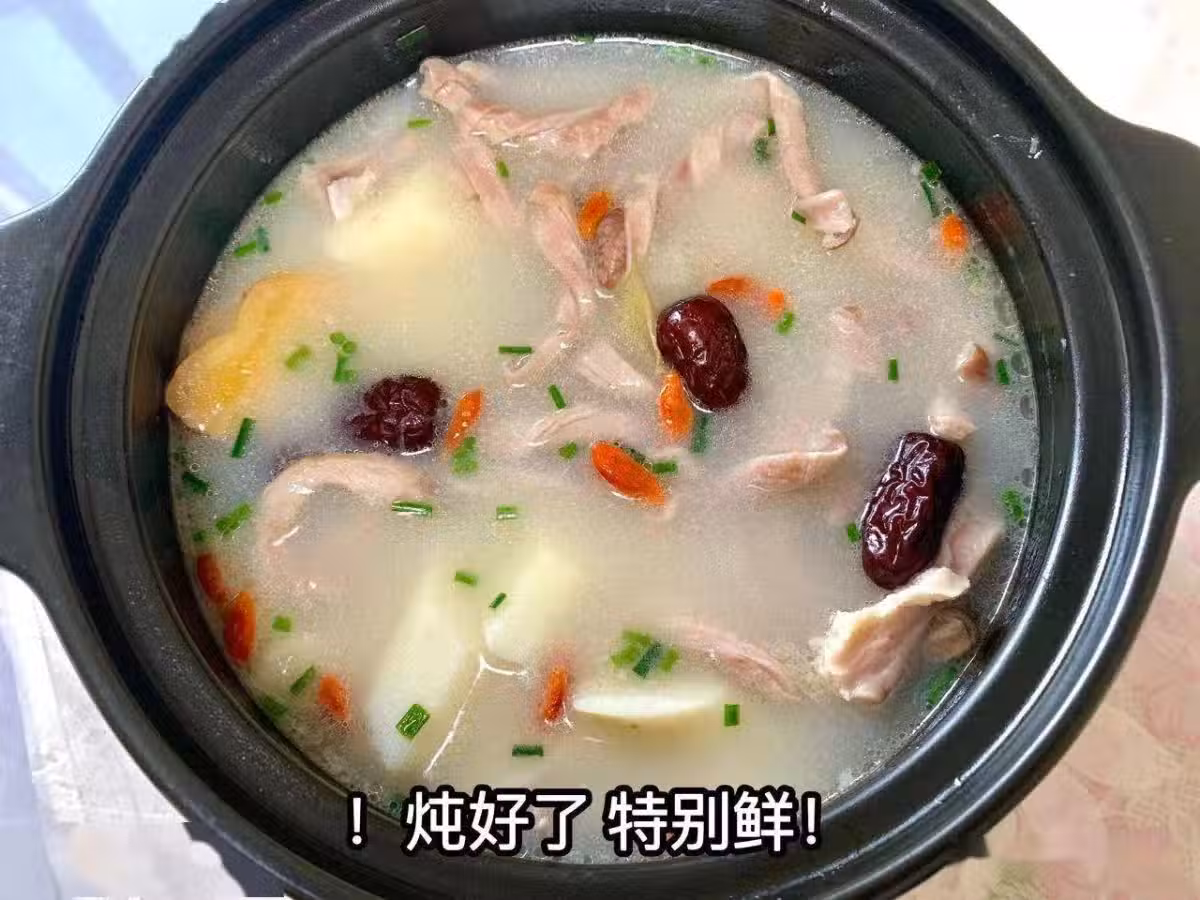 3、準備點大蔥還有薑片,倒入食用油,放入蔥姜爆香,接著放入豬肚條翻炒兩分鐘,加入開水,在放幾顆紅棗,轉成小火燉一個小時,時間快到的時候把山藥削皮切成塊,在放鍋中,轉成中火燉15分鐘,最後放入鹽,一小勺胡椒粉,撒蔥花和枸杞出鍋即可。