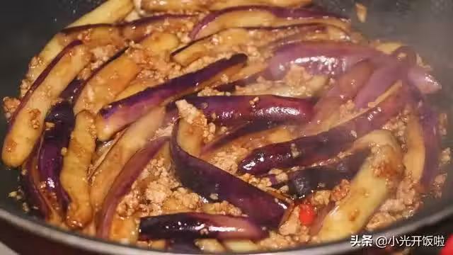 步驟⑥:茄子炒好後轉移到砂鍋里,放到粉絲的上面,然後倒入一碗清水,因為茄子和粉絲都是比較吸水的,先用大火煮開在轉小伙煮五分鐘,最後在撒蔥花就完成了。