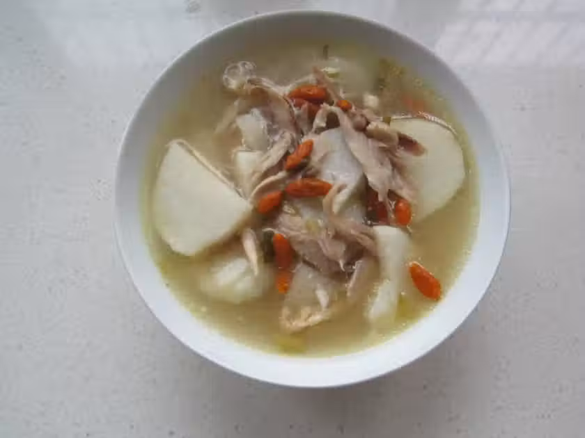 草雞半隻、鐵棍山藥150g、生薑8g、枸杞6g、料酒2g、鹽適量、熱開水適量。