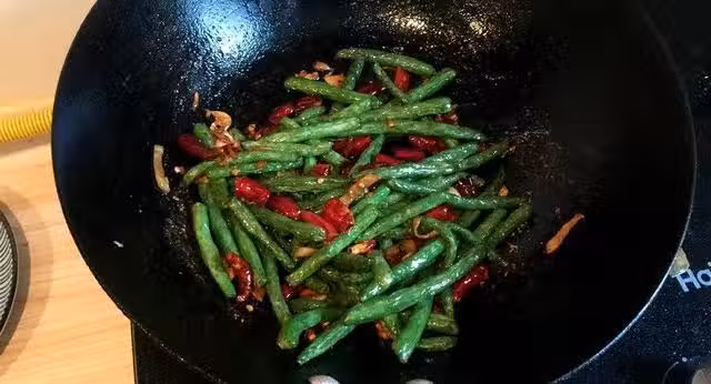 3.下豆角、鹽、雞精、醬油。轉大火,快速翻炒,混合均勻即可。