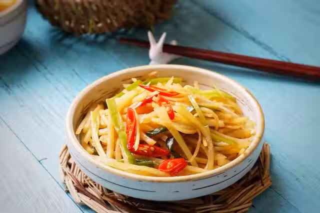 1.土豆去皮,切絲,用水衝掉澱粉,瀝干水分備用