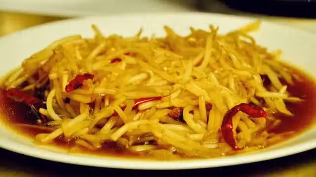 1.水燒開後,放入豆芽焯水1分鐘,撈出控干水分。