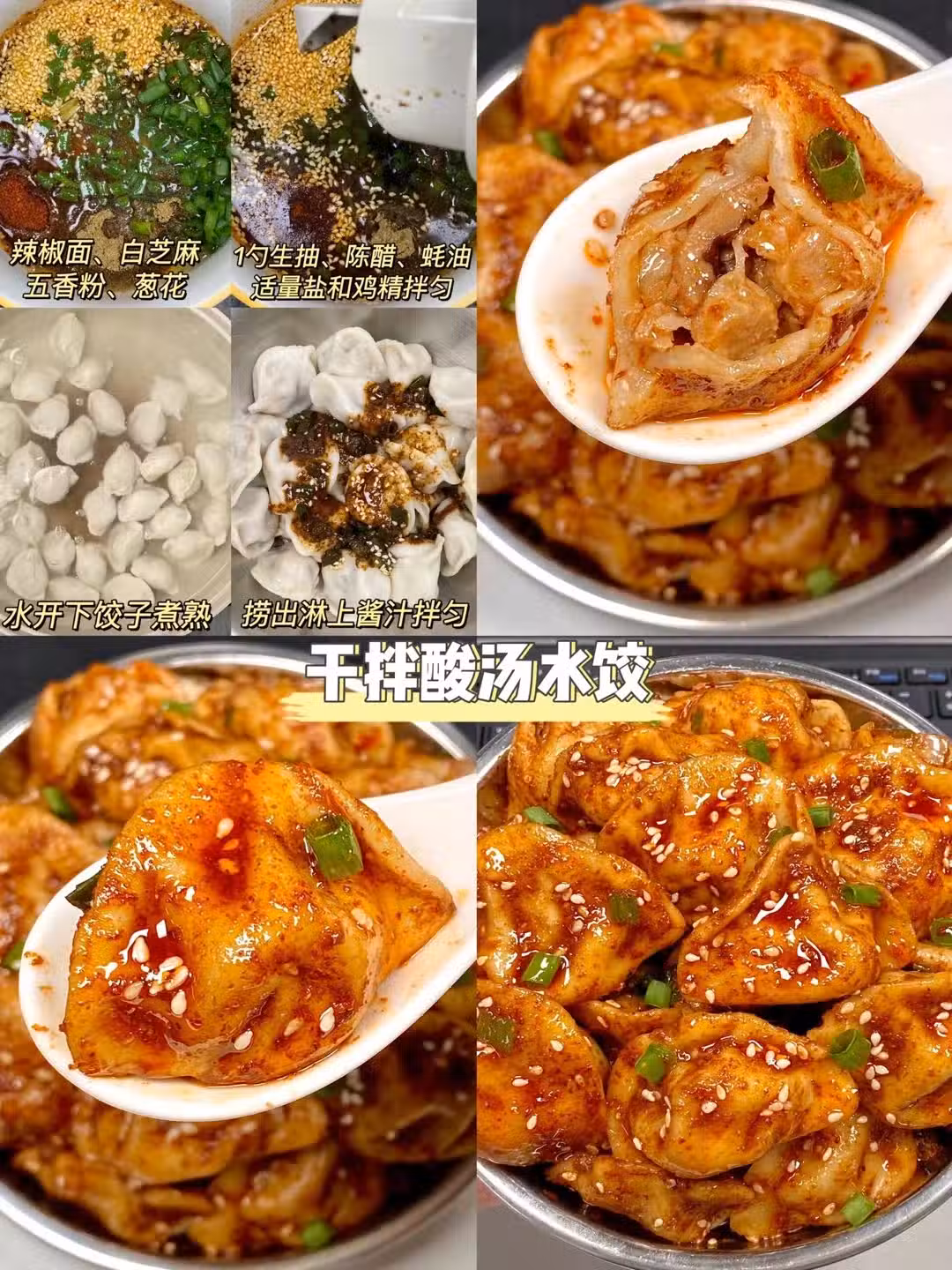 干拌酸湯水餃是一道集鮮香、酸辣於一體的水餃。首先準備好水餃,按照傳統方法煮熟,撈出瀝干水分。在一大碗中,調配好乾拌汁,需要用生抽、香醋、辣椒油、酸湯、花椒油、蒜泥等調料混合均勻。將煮好的水餃放入調料碗中,拌勻至水餃均勻裹上酸湯干拌汁,出鍋撒上蔥花即可。