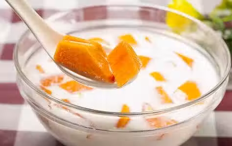 4.把木瓜粒和一半牛奶、雞蛋清混合液放在空碗里。隔水蒸5分鐘。