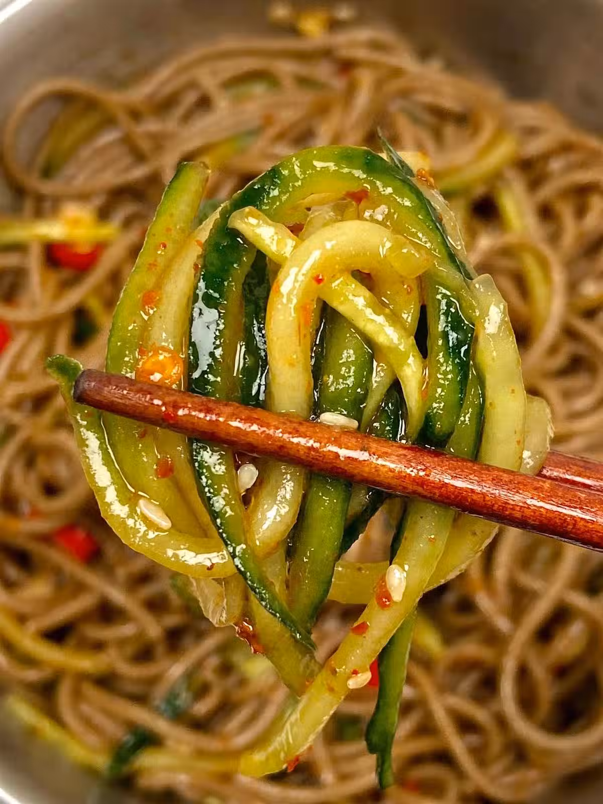 🥒食材:蕎麥面、黃瓜、蒜、小米辣